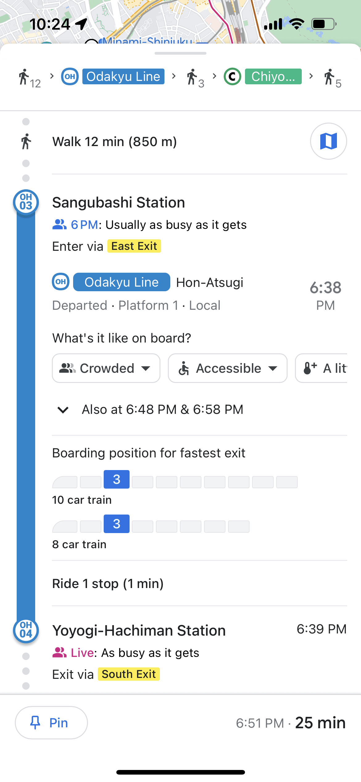 Google Maps takes all of this into consideration, pioneering some helpful UI features that are unique to Japan: which entrance or exit to use, how long to reach the train, even which car to board for the fastest transfer. You may get a little turned around from time to time, but you’ll make it. And all of this can be timed to the minute because Japanese trains are never late.